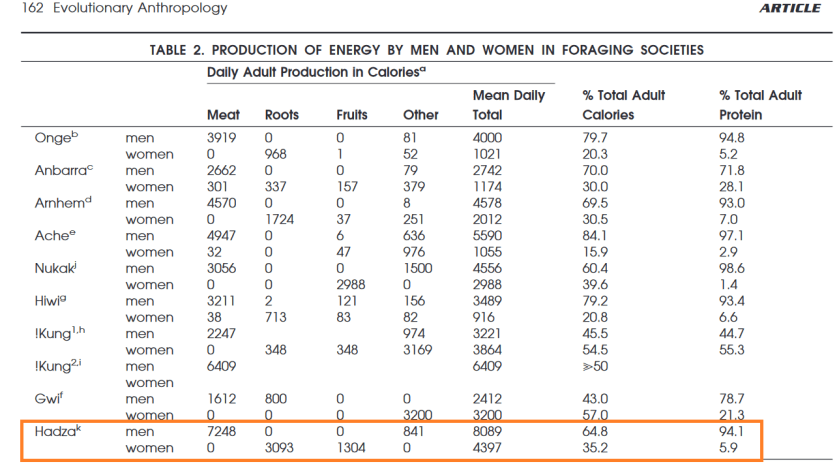 D’autres donnent leur méthode, mais elles semblent parfois mal estimer les valeurs. Ex : Kaplan, 2000, qui donne une part comestible sur poids vif de 85%, ce qui semble surestimé. Ainsi, avec les mêmes données de départ, celles de Hawkes, 1991, Kaplan arrive chez les Hadza à 58% pour la part calorique de la chasse, et Marlowe arrive à 19,3%… (Kaplan surestime à la fois la part comestible des animaux, 85% selon lui, et le nombre de chasseurs dans le total des contributeurs). Il est possible en revanche que Marlowe sous-estime la valeur calorique des animaux, comme je l’explique [ici]