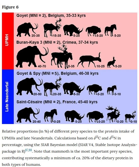 « For both UPMH individuals, the two most relevant prey species are the mammoth and the reindeer. Each species comprised roughly 25–30% of the meat protein source. The rhinoceros contributed ca. 15 to 20%, the bovines and horses around 10% of the dietary proteins. Cave bears played the least important role, with a maximum contribution of around 5% of the total protein intake. These results are similar to those of Neandertals, which indicates that both UPMHs and Neandertals had a similar prey choice with preference for mammoth and reindeer. […] The zooarchaeological records from Goyet and Spy fully support mammoth hunting episodes with a special preference for younger individuals and possibly their mothers. Interestingly, based on stable isotopes, the mammoth seems to contribute the major part of the dietary protein of humans in a time range between 50,000 and 30,000 years ago and across wide areas spanning from SW France to the Crimean Peninsula. »